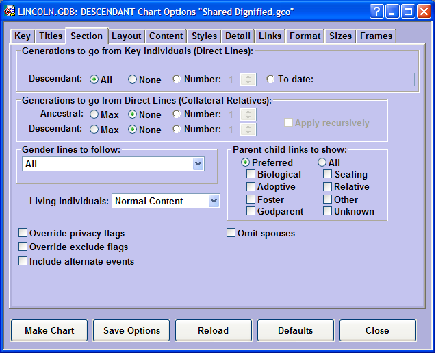 A genealogy database can have tens of thousands of individuals. Often, the individuals you want to show on a chart are only a small subset of the database. The Section page is used to specify these limits. In addition to number of generations, cutoff dates, and collateral relatives, it can also limit the chart by controlling which types of parent-child links to follow, and whether spouses and living individuals are included. You can also restrict the chart to follow only male lines or female lines.