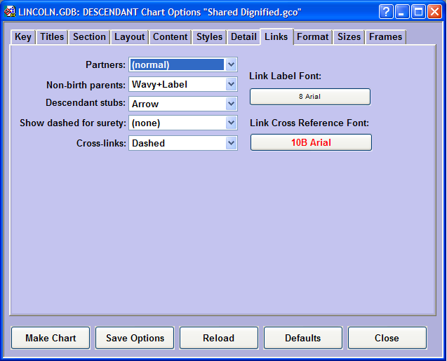 The Links page provides control over special styles that can be added to the connecting lines between chart boxes. Particular relationships, such as "partners" or "non-birth parents" can be indicated this way.