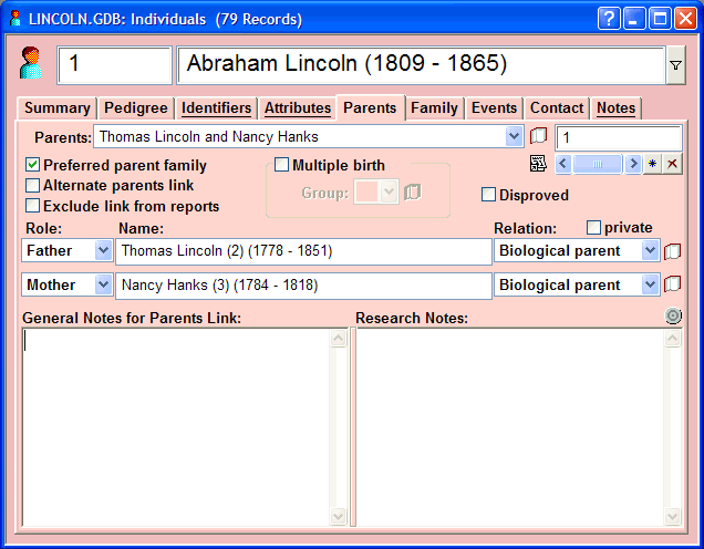 The Parents page displays information on the parent families of the current individual. Genbox can store any number of parents for each person.