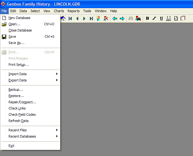 functions, opening and closing database files, opening saved chart and report files, importing data files, and exporting data files.