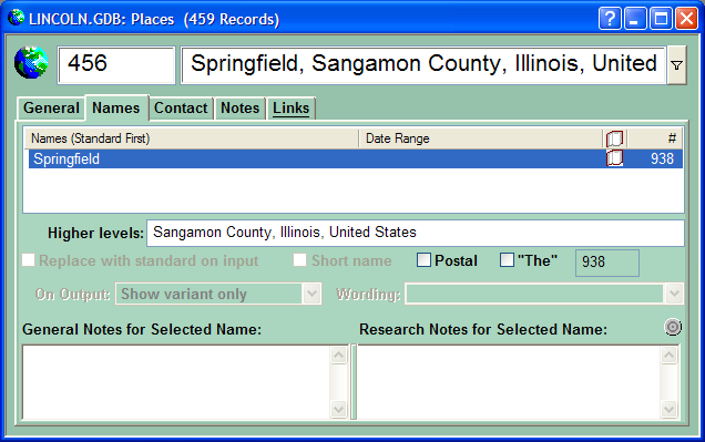 When Replace with standard on input is checked, this name variant will automatically be replaced by the standard name when it is typed into a place box on the Events page and other pages where places are entered. For example, suppose we have a place record for the state "Missouri", and it has a name variant "MO" that has Replace with standard on input checked. On the Events page, you click on the Place box, type "St. Louis, MO", and press ENTER. The text is automatically changed to "St. Louis, Missouri".