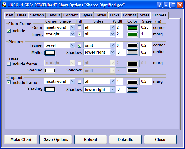 As the finishing touch, frames can be added to the chart, picture boxes, title box, and legend. Frames are excellent for setting off an item from its surroundings, adding color and drawing attention. Frame choices include corner shape, corner fill, sides to include, pixel width, color, corner size, margin size, matte, shading, and shadow. The chart frame can also be a double frame, with independent settings for each. These options are set on the Frames page.