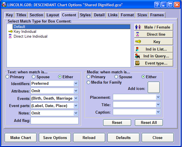 After choosing the individuals to show and how the chart should be laid out, the next choice is what to include for each individual. The Content page is for this purpose. You can set the content for every individual to be the same. Or, you can vary the content for selected groups of individuals, emphasizing what you consider important. You can also vary content for particular event types.