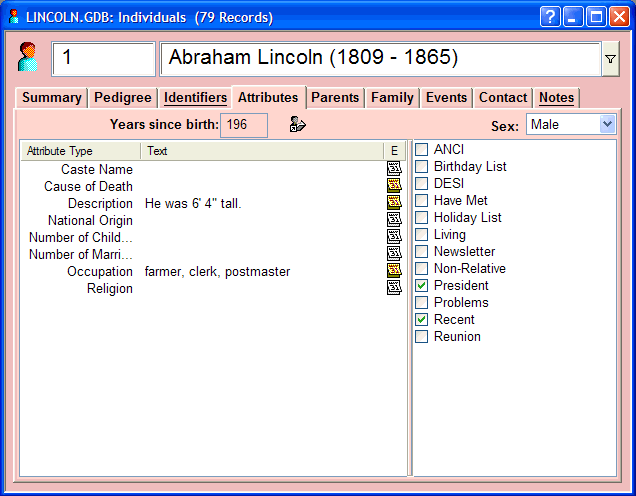 The Attributes page displays attribute information for the current individual. An "attribute" is a fact or data item that generally holds for an extended period of time, and is not tied to a single event. Attributes can be text, such as "He was tall", or they can be a yes/no value, such as "Living". Each check box stores the value of the corresponding "flag". Genbox can store an unlimited number of attributes for each person, and an unlimited number of text attributes and individual flags can be defined.