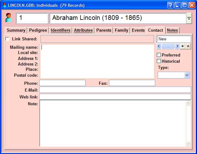 The Contacts page can be used to store addresses and other contact information for living individuals, and historical address information for the deceased.