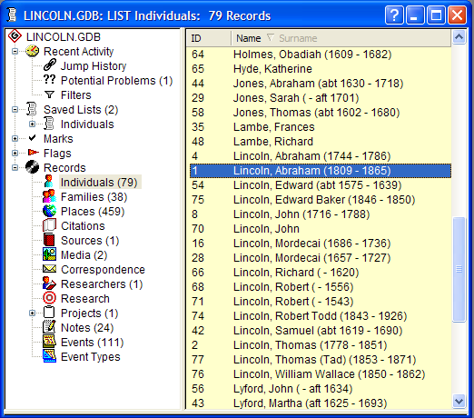 Genbox has a number of predefined lists, such as the lists of Individuals, Families, Places, Sources, and other main data records. Other lists may be automatically created by the program as the results of various commands, including Jump History, Chart Keys, Chart Starters, Chart Results, Query Results, and Potential Problems.