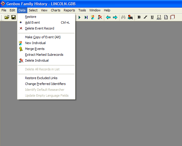 The Data Menu provides options for performing special operations on data records of the current view: adding records, deleting records, and merging records.