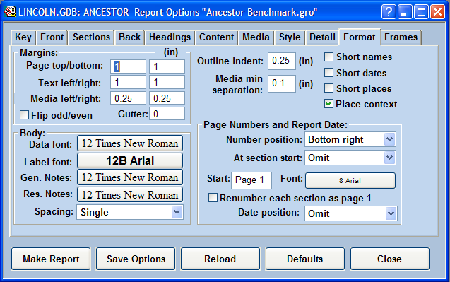 The Format page is used to specify the margins, indents, spacing, main fonts, pagination, and page numbering for the report.