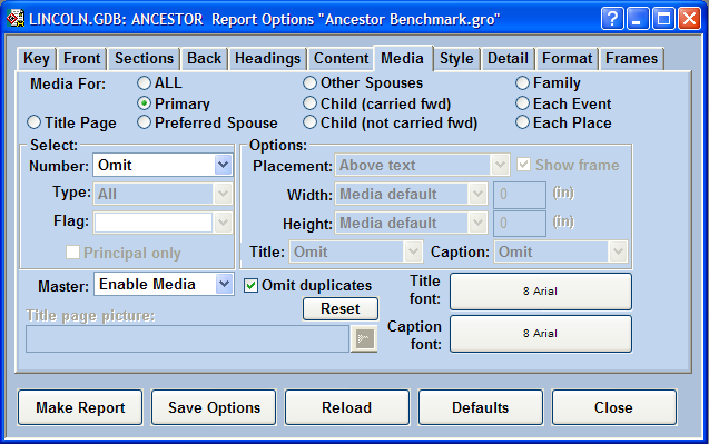 Multimedia can be linked to Individuals, Families, Events, Places, Sources. On genealogy reports, Individuals can be further divided into Primary, Preferred Spouse, Other Spouses, Child Carried Forward, and Child Not Carried Forward. On the Media page, you can specify the multimedia you want to include for each of these groups, as well as a picture for the title page.